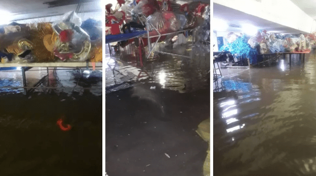 Fantasias de alas inteiras, carros alegóricos, máquinas, tecidos, instrumentos e documentos ficaram debaixo d’água, comprometendo um trabalho feito pela comunidade o ano todo. Em alguns pontos do barracão da escola, a água ainda não baixou completamente. Tem fantasia submersa, boiando, o que dificulta muito o que precisa ser feito.